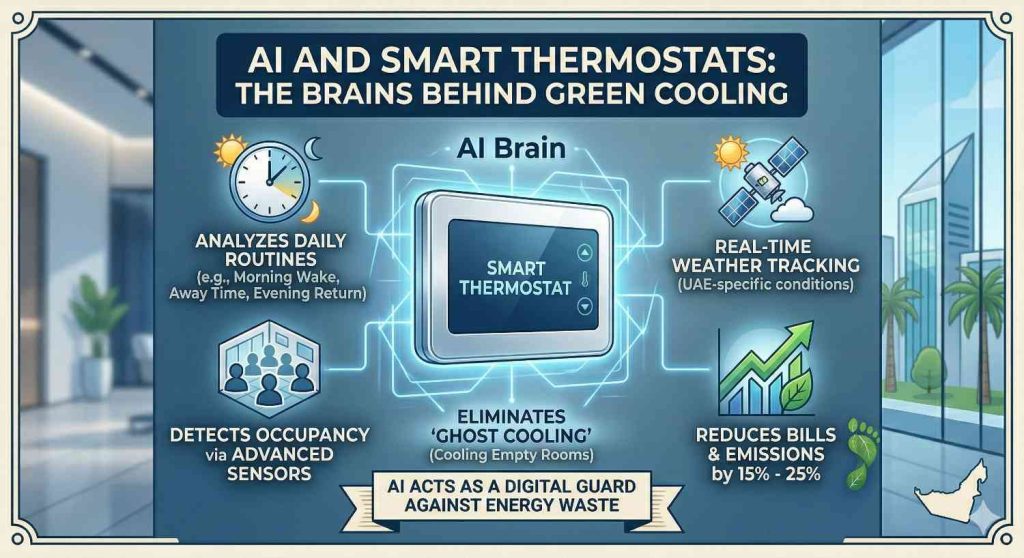 One of the most innovative leaps in reducing the UAE’s carbon footprint is the integration of Artificial Intelligence (AI). Modern central AC systems are now being paired with AI-driven smart thermostats that do far more than just schedule “on” and “off” times.