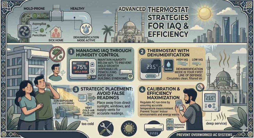 The thermostat’s role in managing indoor air quality (IAQ) is often overlooked but is vital for the health of Sharjah residents. High humidity levels in the summer, if not properly managed, can lead to the growth of mold (such as Aspergillus or Penicillium) within the dark, damp environments of the AC ducts and evaporator coils. Once mold becomes established, the AC system acts as a delivery mechanism, circulating spores throughout the home every time the unit engages. A properly functioning thermostat with a dehumidification mode is the first line of defense against this “sick building syndrome.” By maintaining indoor relative humidity below 60%, the thermostat prevents the conditions necessary for mold to flourish.
