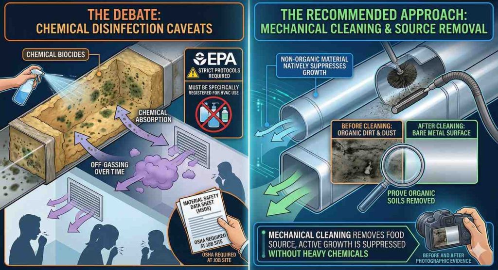 HVAC systems that are to be sanitized contain porous materials that should not be subjected to potential toxins, as these chemicals can absorb into the material and off-gas into the occupied space over time. Neither mold nor bacteria grow on non-organic materials natively; they require the presence of dust and dirt containing organic material to serve as a food source. Therefore, if a system is properly cleaned mechanically, the food source is removed, and biological growth is actively suppressed without resorting to heavy chemical application. To align with safety guidelines and preserve consumer confidence, technicians performing deep sanitization must have the Material Safety Data Sheet (MSDS) available at the job site as required by the Occupational Safety and Health Administration (OSHA). Additionally, cleaners of HVAC systems should be asked to produce photographic evidence showing the condition before and after cleaning to prove that organic soils have been removed rather than simply covered with a biocide.